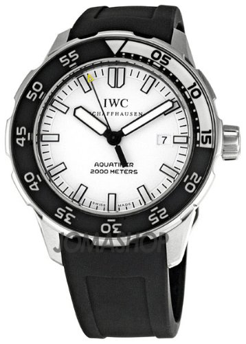 Stainless steel case with a black rubber strap. Unidirectional rotating black ion-plated bezel with silver 15 minute zone. White dial with luminous hands and index hour markers. Minute markers around the outer rim. Luminiscent hands and markers. Date display appears at the 3 o'clock position. Mechanical automatic self-winding movement. Scratch resistant sapphire crystal. Screw down crown. Solid case back. Case diameter: 44 mm. Case thickness: 14 mm. Tang clasp. Water resistant at 2000 meters/ 6600 feet. Functions: hours, minutes, seconds, calendar. IWC Aquatimer Automatic 2000 White Dial Mens Watch IW356806.