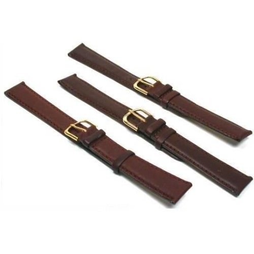 3 New Calf Leather Watch Bands 18mm. This is a new set of 3 brown padded calf leather watch bands. The inside of the bands are genuine nubuck leather. These brown leather bands have yellow gold plated buckles and single row stitching. These are perfect for high-quality brand name watches such as Rolex, Cartier, Piaget, Breitling and Bulova. The carefully selected specialized leather with texture and shine and decorative stitching is very attractive with all types of watches. All the leather in our collection is selected from the finest tanneries in Europe. These sporty grains in our traditional styling makes them suitable for all lifestyles. The formed and reinforced spring bar holdings give a perfect fit between the watch and strap. Each band measures 18 mm wide and approximately 8 1/4" long.