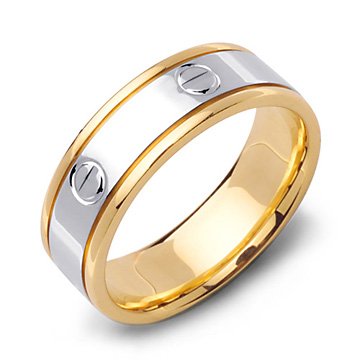Fancy two tone gold wedding band with Cartier inspired patterns throughout the ring. Beverly Hills ring gift box included. NOTE! All weights vary based on the sizes 1/3 and 1/4 partial sizes are available by special order Size smaller than 4 or bigger than 16 are available by special order