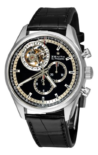 Stainless steel case (42 mm in diameter, 13 mm thick), Transparent screw-down caseback, Black dial with the Zenith star logo, Silvertone luminescent hands and indices, Red pointer sweep second hand for the chronograph, Small second hand mounted on the Tourbillon carriage at the 11 o'clock position, Hours subdial for the chronograph at the 6 o'clock position and minutes subdial for the chronograph at the 3 o'clock position, Date display at the 11 o'clock position, Sapphire crystal, Push/pull crown, Swiss automatic movement, Power reserve of 50 hours, Water resistant to 10 ATM/100 meters/330 feet, Black leather strap, Deployment clasp, Model number: 03.2050.4035/21.C630.
