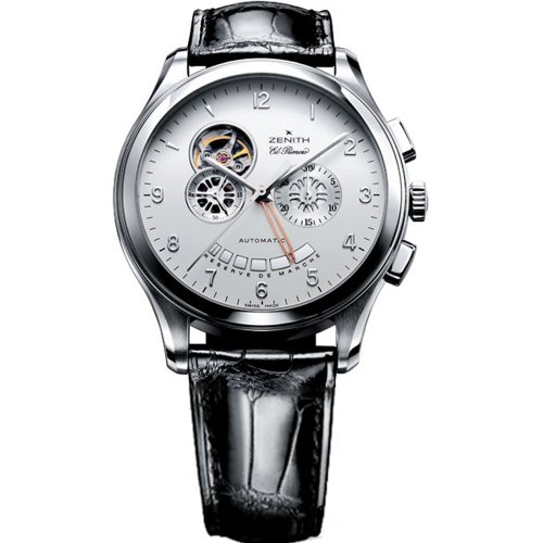 Stainless steel case (44mm in diameter), Transparent sapphire case-back, Off white dial with silver sub-dials, Rhodium hands and hand-mounted Arabic numerals, Open dial at 10 o'clock showing the heart of the El Primero movement, Small second subdial to the right of the 9 o'clock position with a 3-branched hand, Chronograph features a minutes sub-dial to the left of the 3 o'clock and seconds in the center, Anti-reflective sapphire crystal, Swiss automatic mechanical movement (El Primero caliber 4021) with a power reserve of over 50 hours, Power reserve display at the 6 o'clock position, Water resistant to 50 meters/ 165 feet, Black alligator leather strap, Deployment buckle.