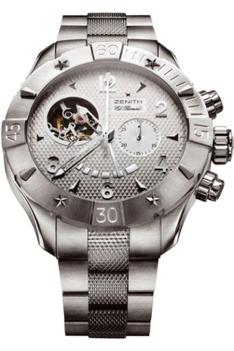 Stainless steel case with a stainless steel bracelet. Unidirectional rotating stainless steel bezel. Silver with skeletal display dial, skeletal hands and alternating index and Arabic numeral hour markers. Minute markers arond the outer rim. 30 minutes sub-dial. Power reserve display. Automatic movement. Scratch resistant sapphire crystal. Screw in case back with engraved with the Zenith Star Crown logo. Skeleton case back. Case diameter: 46.5 mm. Case thickness: 17.5 mm. Deployment clasp. Water resistant at 300 meters / 1000 feet. Zenith Defy Classic Open Stainless Steel Mens Watch 03.0526.4021.01.M526.