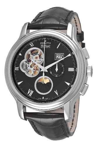 Founded in 1865 by its fastidious owner, Zenith, represented the pinnacle of watchmaking perfection. Georges Favre-Jacot and his company was one of only a few watchmakers that manufactured complete watches. He produced these watches using up-to-date machinery and tools that he built himself. Zenith has garnered more than 1,500 international watchmaking awards and continues to produce wristwatches of distinction. Stainless steel case, transparent caseback, black alligator leather strap, triple-folding buckle, black dial, partial skeleton dial showing the escapement mechanism, double date window between the 1 & 2 o'clock position, moon-phase indicator, small seconds-hand at 9 o’clock position, chronograph feature (seconds, minutes), anti-reflective sapphire crystal, swiss automatic movement, water resistant to 30 meters / 100 feet