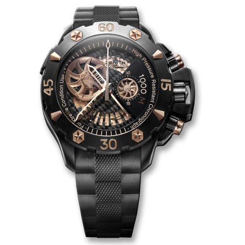 Black titanium case, Screw-down crown, Unidirectional rotating bezel, Rose gold & black titanium braceletTriple folding clasp, Helium valve at 10 oclock, Multi-layer black dial, Luminous hands,Small seconds-hand at 9 o'clock, 30-minute counter at 3 o'clock, Power reserve indicator, Scratch resistant sapphire crystal, Swiss automatic chronograph movement, Water resistant to 1000 meters / 3330 feet